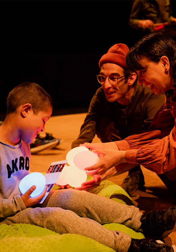 Arbre, tout un monde permet d’entrer dans un univers multisensoriel et pleinement interactif, enveloppé de lumière douce, de musique et aussi de silence, où cinq personnages s’adaptent constamment aux diverses particularités sensorielles de leur public.